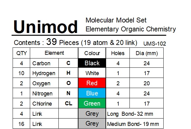 این ست مولکولی دارای 39 قطعه مختلف شامل 19 گوی یک، دو، چهار حفره و 20 قطعه رابط است، لذا با اتصال این گوی ها توسط رابط ها به یکدیگر ساختار مولکولی سه بعدی انواع مولکول و پیوند میان آنها اموزش داده میشود ، در این مجموعه گوی ها در چندین رنگ استاندارد (مشکی، سفید، قرمز،آبی ، سبز ) نماد اتم ها و رابطه نماد پیوند ها میباشد ، اتصال متوسط برای ساختار فضایی مدل گلوله و میله و اتصال بلند برای پیوندهای دوگانه وسه گانه استفاده میگردد. این کیت اموزشی برای اشنایی با مفاهیم اتم ، افزایش تجسم فضایی، ساختارمولکولی وپیوندها بسیار مناسب میباشد.