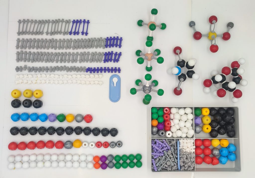 این کیت مولکولی با گلوله های خاص برای دانشگاه طراحی شده و دارای 220 قطعه مختلف شامل 80 گوی و 140 قطعه رابط میباشد. با اتصال این گلوی ها به یکدیگر ساختار مولکولی سه بعدی انواع مولکولهای پیچیده و انواع پیوند میان آنها اموزش داده میشود ، در این مجموعه گوی ها در چندین رنگ (مشکی، سفید، قرمز،آبی ، سبز، زرد، طوسی، بنفش، نارنجی ) تا 7 حفره با زوایای بسیار دقیق اتم ها و اتصالات در چندین رنگ و نوع ( سفید، طوسی، بنفش) نماد پیوند ها میباشد ، اتصال کوتاه برای ساختار مدل فضایی فشرده ، اتصال متوسط برای ساختار فضایی مدل گلوله و میله و اتصال بلند برای پیوندهای دوگانه وسه گانه استفاده میگردد. این کیت اموزشی برای اشنایی با ساختار فضایی انواع مولکولهای خاص ،افزایش تجسم فضایی، ساختارمولکولی وپیوندها برای دانشجویان و اساتید دانشگاه بسیار کاربرد داشته و توانایی ساخت انواع مدل های پیچیده تا ظرفیت 7 مانند IF7 را دارا میباشد .